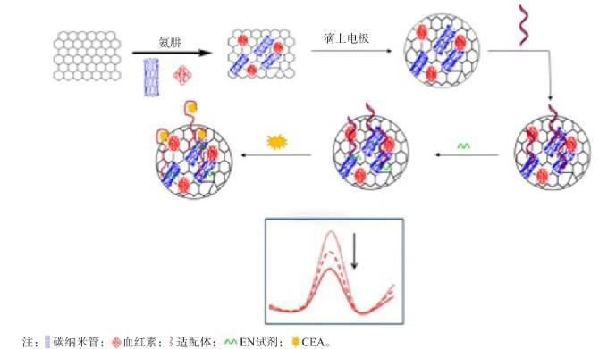 4.1.1抗原類生物標志物檢測過去幾十年,基于適配體的生物傳感器因其良好的靈敏度和選擇性、快速響應和低成本等優點,被廣泛應用于低濃度抗原類標志物的檢測。癌胚抗原(carcinoembryonic antigen,CEA)是在胚胎內胚層上皮中發現的潛在生物標志物,一般用于監測結直腸癌的治療效果,以及輔助診斷乳腺癌、胃腸道腫瘤、肝癌、肺癌、卵巢癌和胰腺癌。MAZLOUM-ARDAKANI等開發了一種基于多壁碳納米管、血紅素和石墨烯納米片的電化學適配體傳感器,用于檢測CEA,線性范圍為1.0×10-15~1.0×10-8g/mL,檢測限為0.82 fg/mL;檢測原理為納米復合材料多壁碳納米管可提高導電性,并加速血紅素和電極之間的電子轉移,當CEA結合適配體時,血紅素的信號會進一步降低。這種低成本、高靈敏度和特異性的生物傳感器在臨床樣本CEA檢測中有較大的應用價值。見圖1。