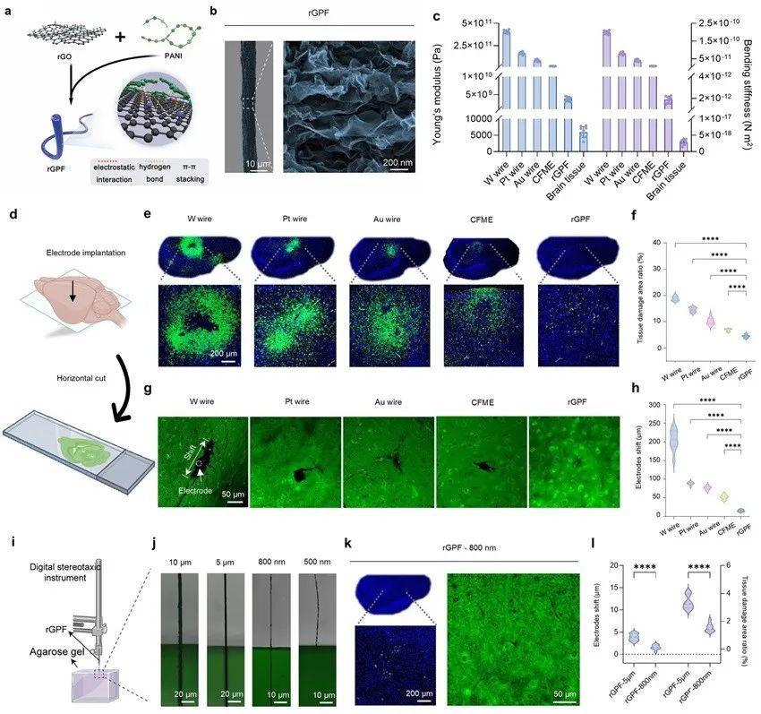 華東師范大學田陽教授團隊近期創制了一種具有高生物相容性的自支撐植入式聚合物微電極(rGPF),實現了自由行為動物大腦中的Mg2+和Ca2+的同時監測和實時量化。通過在還原氧化石墨烯(rGO)中摻入了導電性聚苯胺(PANI),形成了直徑約800 nm的rGPF超細電極。與傳統的金屬絲和碳纖維相比,rGPF表現出優異的生物相容性和最小的物理損傷,這歸功于rGPF較低的楊氏模量。盡管直徑較小,但它仍表現出足夠的彎曲剛度,可直接自支撐植入小鼠腦深部區域,無需外部輔助裝置,從而降低了額外物理損傷的風險(圖1)。