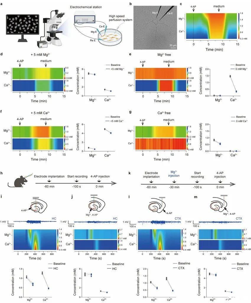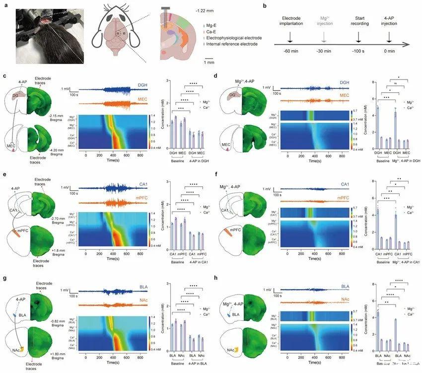 利用這一強大的工具,在體外4-氨基吡啶(4-AP)的誘導下,首次觀察到Mg2+的變化先于Ca2+,以及Mg2+對Ca2+內流的拮抗作用(圖3)。此外,由于采用了無額外電流的電位測量法,Mg-E、Ca-E、內參比電極和電生理電極被集成到了一個微電極束中,可按需植入目標腦區而不會發生串擾。最終發現,癲癇發作時細胞外Mg2+和Ca2+的初始變化時間與神經通路相一致,在上游腦區添加Mg2+可抑制下游腦區的Ca2+流入和癲癇樣放電活動(圖4)。該結果被田陽教授團隊首次報道。