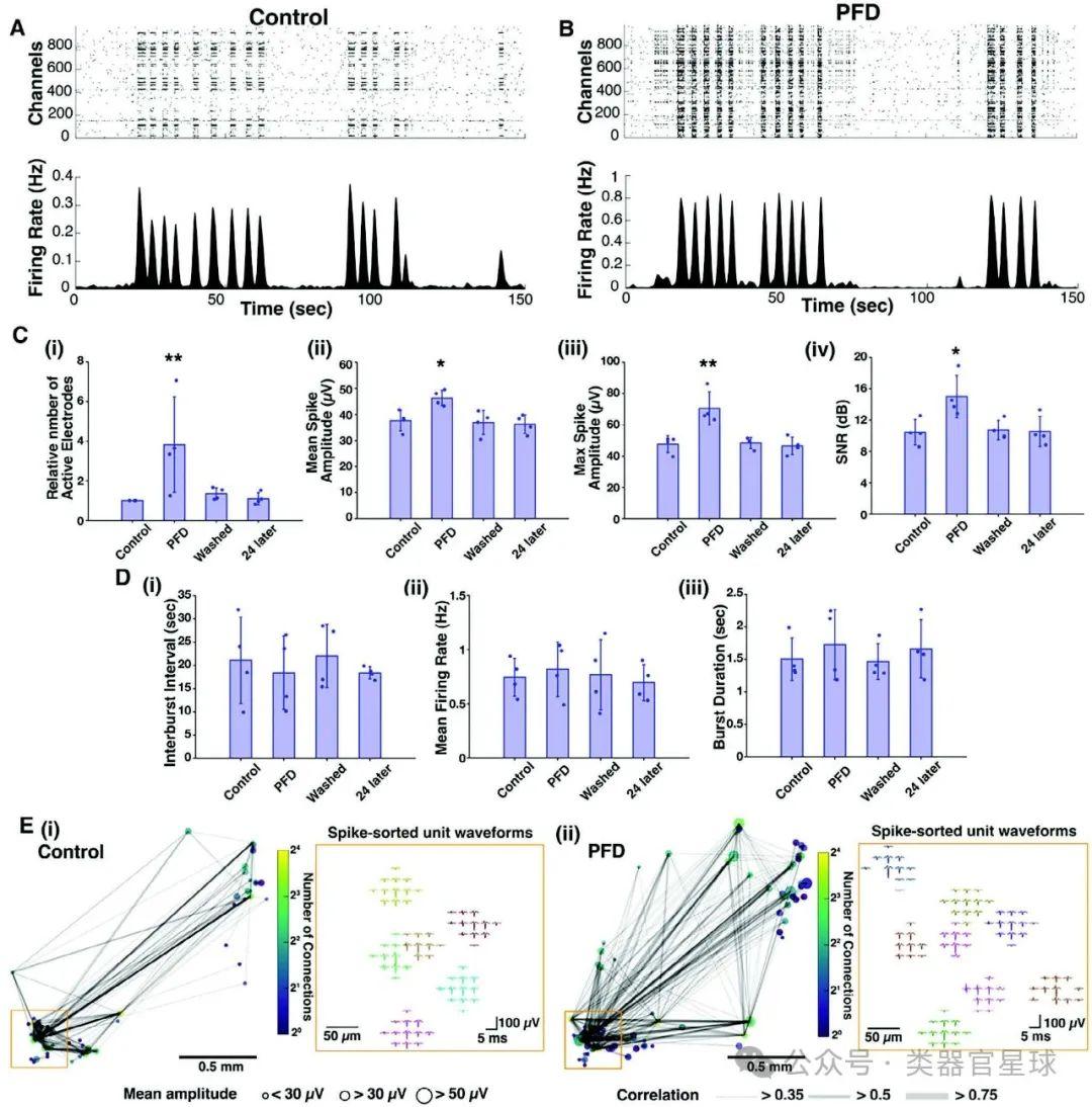 PFD的使用不僅提高了信號的幅度,還增強了信號的信噪比,使得MEA能夠更準確地檢測神經網絡的活動,包括神經元之間的連接和網絡的同步性等。