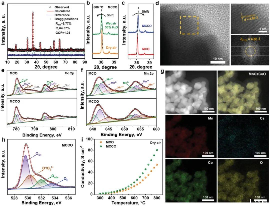 圖1 MCCO粉末的晶體結構和特性。a)MCCO材料的精細XRD圖案。b)MCCO在600°C下蒸汽處理(30%H2O)10小時之前和之后的XRD圖案。c)MCO和MCCO粉末的XRD圖案。d)MCCO的高分辨率TEM圖像和快速傅里葉變換圖案。e)MCO和MCCO的Co 2p XPS曲線。f)MCO和MCCO的Mn 2p XPS結果。g)MCCO的HAADF圖像和EDS映射結果。h)MCCO的O 1s XPS曲線。i)300-800°C下MCO和MCCO的電導率。