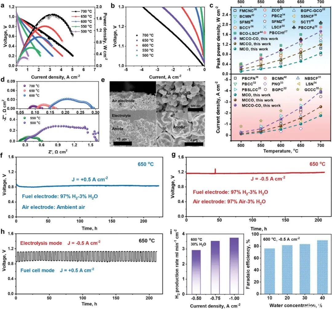 圖3帶有MCCO-CO電極的PCEC在氧還原和水分解反應中的電化學性能。a)在500-700°C下以FC模式測試MCCO-CO電池的I-V-P曲線。b)在500-700°C下以EC模式測試的MCCO-CO電池的I-V曲線。c)MCCO-CO與其他報告的電極比較。d)在500-700°C下測量的MCCO-CO單電池的EIS。e)MCCO-CO電池的SEM圖像。在650°C下以f)FC模式和g)EC模式測試的單電池的耐久性。h)在650°C時電流密度為±0.5 A/cm2的可逆循環操作,兩種模式之間切換間隔為2小時。i)在不同電解電流密度和蒸汽濃度下,采用MCCO-CO尖晶石氧電極的電池的H2生成速率和法拉第效率。