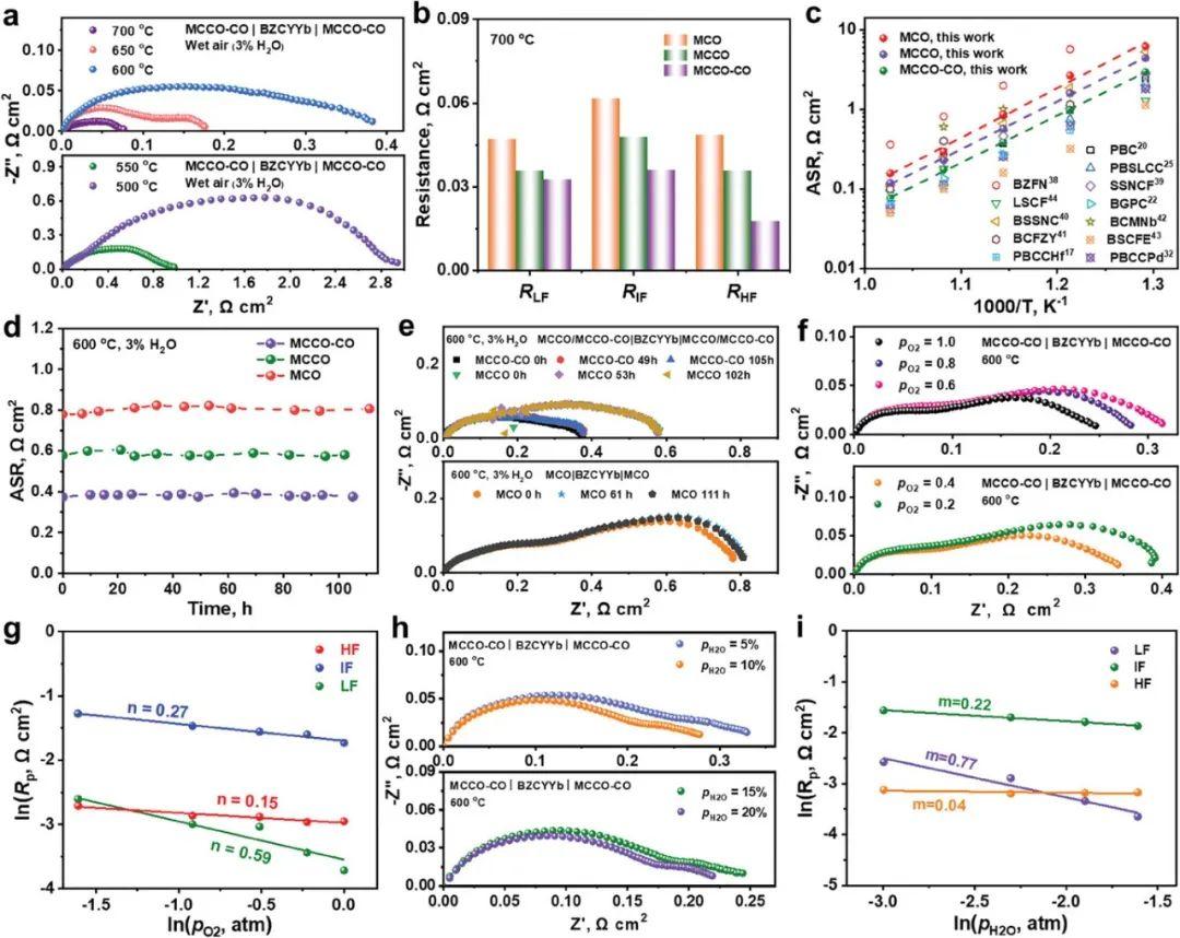 圖2 MCCO-CO電極的電化學性能和耐久性。a)在500-700°C下測量的MCCO-CO的EIS。b)在不同頻率范圍內MCO、MCCO和MCCO-CO的Rp比較。c)MCCO-CO和其他電極的Rp值比較。d)在含有3%H2O的空氣中600°C時MCO、MCCO和MCCO-CO的短期穩定性。e)在不同測試時間的MCO、MCCO和MCCO-CO的EIS。f)不同氧分壓下MCCO-CO對稱電池的EIS。g)MCCO-CO的Rp與p O2的依賴關系。h)不同水分壓下MCCO-CO對稱電池的EIS。i)MCCO–CO的Rp依賴性與p H2O的關系。