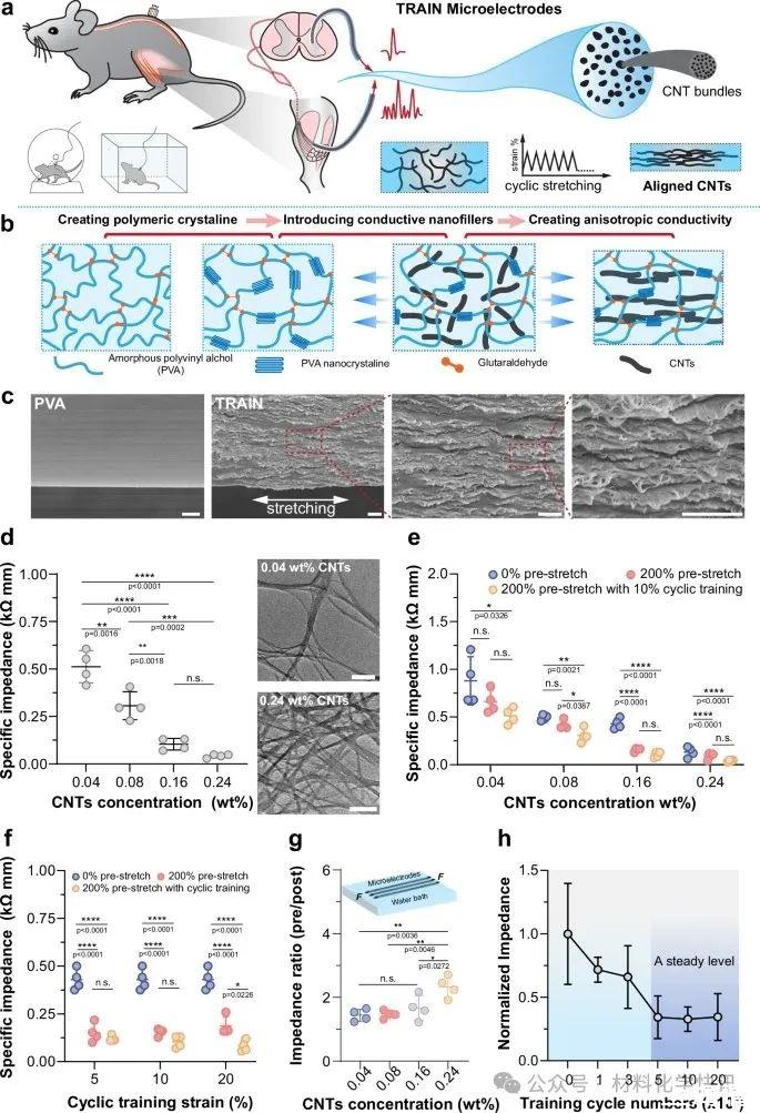 近日,美國紐約州立大學賓漢姆頓分校饒思圓和汪前彬受納米導電材料在聚合物基質中重排特性的啟發,將具有高縱橫比的導電碳納米管引入到半結晶聚乙烯醇PVA水凝膠中,通過循環拉伸過程構建了具有各向異性的導電路徑,從而優化了導電水凝膠性能。實驗制備的各向異性導電水凝膠電極(直徑187±13μm)在20%應變條件下經過20,000次循環拉伸后仍保持優異的機械穩定性和較高的拉伸性能(64.5±7.9%),同時具有較低的電化學阻抗(在1 kHz頻率下,1 cm2的電極阻抗為33.20±9.27 kΩ)。