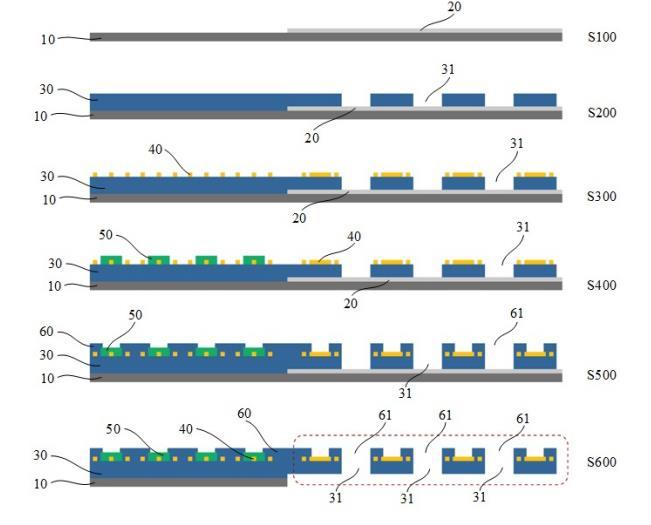 S600:腐蝕掉犧牲層20,并將襯底10的第一部分切除。