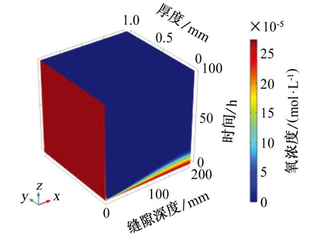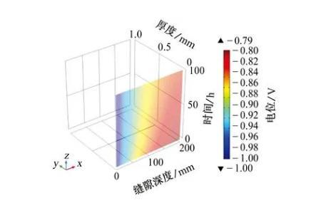 由圖4可以看出,在縫口處溶解氧濃度沒有發生變化,這是因為外部溶液為無限稀釋溶液,氧氣可以從外部溶液中不斷得到補充。在縫隙中由于氧氣被還原反應消耗,縫口處的氧氣在較短時間內被消耗,縫內溶液中溶解氧的消耗速度遠大于氧氣擴散的補充速度,溶解氧濃度隨著時間的推移而急劇下降。這是陰極保護效應開始時溶解氧濃度分布的一個典型現象。隨著縫隙深度的增加,縫內溶解氧消耗的速度逐漸變緩,這是由于只有少量的氧氣擴散到縫隙深處,并且縫隙深處還原反應速率比較低,當溶解氧消耗殆盡時,外部氧氣無法及時擴散到縫隙深處,這和以往的試驗研究結果相同。
