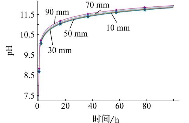 如圖2和圖3所示,縫隙中每個點的pH隨著時間的延長而增加,在施加極化電流后的5 h之內,溶液的pH迅速從6.8升高到10以上;隨著時間的繼續延長,溶液pH逐漸穩定。溶液pH隨縫隙深度的增加而升高,約100 h后其pH穩定在12左右,在距離縫口約15 mm處溶液pH出現峰值。