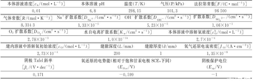 溶液pH受cOH-的影響,OH-在縫隙內的運動方式主要為擴散和電遷移,這受到縫隙形狀和極化電流的制約。其擴散的主要形式是從縫內向縫口部分擴散,電遷移速率反應為電位梯度的大小,電位梯度高,OH-的遷移速率越高。pH與cOH-的關系式如下: