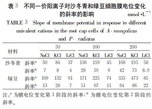 這一現象說明沙冬青對于鹽離子進入根自由空間以及進一步跨膜進入胞內的抵抗能力都要強于綠豆。我們用同樣的方法計算出50、100和200 mmol/LNaC1、KC1和LiC1處理下,兩種植物根冠細胞膜電位去極化過程中兩個階段的斜率,進一步分析不同種類和濃度的一價陽離子對沙冬青和綠豆根冠細胞膜電位的影響(表3)。表3中所列數據均為3次重復試驗的平均值。