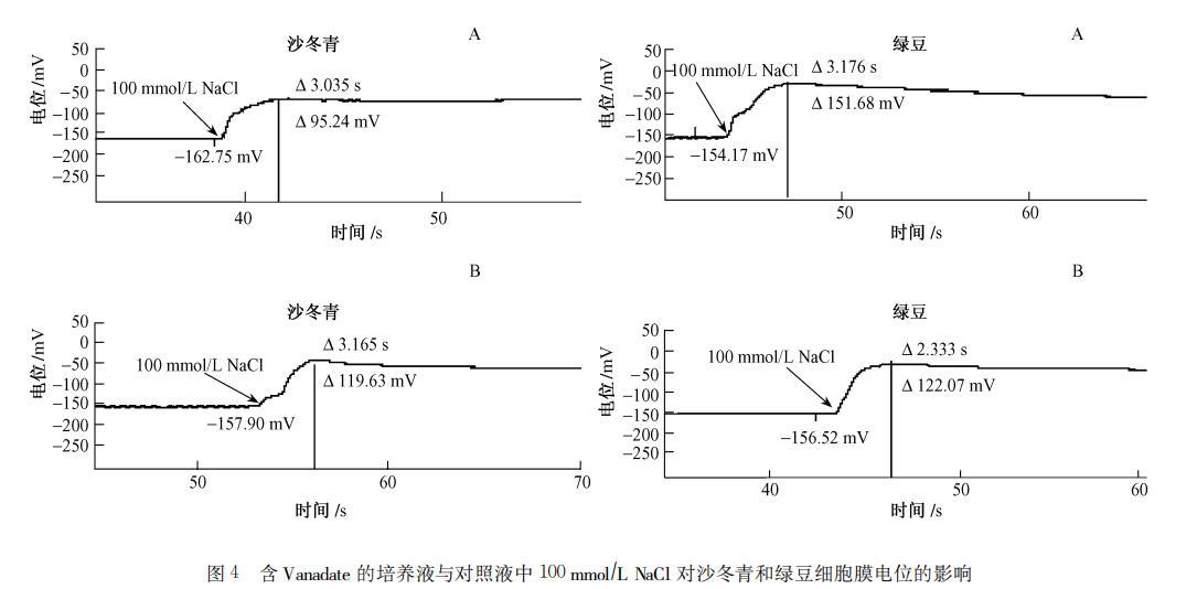 圖4含v nadat的培養液與對照液中100mmol/LNaC1對沙冬青和綠豆細胞膜電位的影響