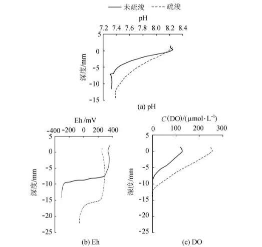 圖2中深度為0 mm表示沉積物-水分離界面,深度為負(fù)數(shù)表示在水土分離界面以下。由圖2(a)可見,疏浚前后表層沉積物中pH值變化不大,范圍均在7.3~8.3之間,疏浚柱子中深度在-13 mm以下pH值趨于穩(wěn)定,為7.4,未疏浚柱子中pH值在深度-8 mm以下穩(wěn)定至7.3。疏浚柱子的pH值略小于未疏浚柱子的pH值,均呈弱堿性。未疏浚柱子pH值相對較小的原因可能是其中沉積物中含有較多的有機(jī)質(zhì)沉積物,其生物化學(xué)作用產(chǎn)生的二氧化碳或有機(jī)酸等使pH值降低。對比王旭東等運(yùn)用微電極研究階段的變化趨勢,再結(jié)合本文圖2(c)中DO數(shù)據(jù),也可得出與本試驗(yàn)一致結(jié)果。