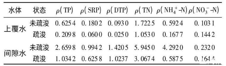 表2疏浚前后上覆水和間隙水中氮磷質(zhì)量濃度mg/L