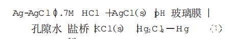 傳統的pH微電極含有一層玻璃膜,內腔充滿鹽酸,引出端是Ag/AgCl(可由銀線在0.1 m ol/L鹽酸中以0.1 m A/cm2的電流密度電解形成)。電極用于測量沉積物孔隙水時,與飽和甘汞電極(SCE)的電池表達式為: