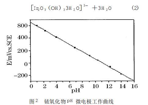 圖2是銥氧化物電極的工作曲線,可以看到在pH1~14范圍內,銥氧化物電極的電位與溶液的pH均表現出良好的線性。固態氧化銥電極測量pH的反應式為: