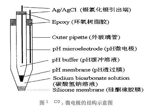 CO 2微電極的結構通常是所謂的Severinghaus型(圖1),即采用pH電極作為內芯,待測溶液中的CO 2通過氣體選擇性硅酮橡膠膜進入電極腔內與碳酸氫鈉體系相互作用從而改變腔內的pH值,由pH芯電極測量腔內的pH變化引申出CO 2分壓pCO 2值。由于化學反應過程復雜,pCO 2電極的穩定性差且響應慢,T98約為5分鐘。加入碳酸脫水酶于腔內的碳酸鹽體系能提高電極的響應速度,使T98達到2分鐘左右。另外,De Beer等研制出一種基于液體離子交換膜pH微電極的快速響應pCO 2微電極并應用于環境測量,響應時間在1分鐘以內。