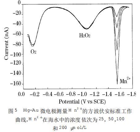 圖5 Hg-Au微電極測量M n2+的方波伏安標(biāo)準(zhǔn)工作曲線,M n2+在海水中的濃度依次為25,50,100和200μm ol/L