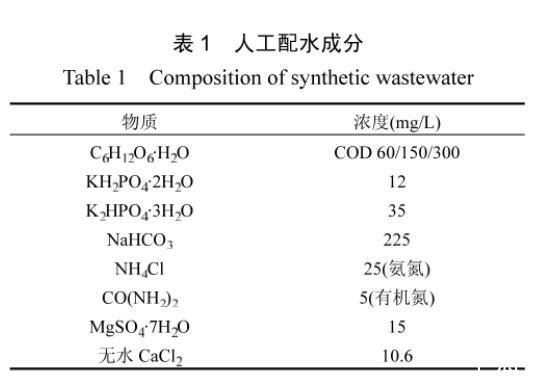 實(shí)驗(yàn)采用PVC材料制作的反應(yīng)器模擬排水管道。裝置示意如圖1所示,最上方為高位水箱,實(shí)驗(yàn)污水從3個等高的高位水箱流經(jīng)各個坡度相同的排水管道及中間水箱后到達(dá)各自的低位水箱,然后采用磁力循環(huán)泵將水轉(zhuǎn)移至高位水箱,由此進(jìn)行循環(huán),其中PVC管內(nèi)壁貼有PVC薄片作為生物膜生長的載體。由于污水流動過程中水力條件相同,因此,在同一批次實(shí)驗(yàn)過程中,3套反應(yīng)器中剪切力條件相同的,只有水質(zhì)條件不同。實(shí)驗(yàn)采用人工配水,配方見表1.為了更好的模擬真實(shí)廢水中的情況,配水中還加入了生物膜生長所需的微量元素。