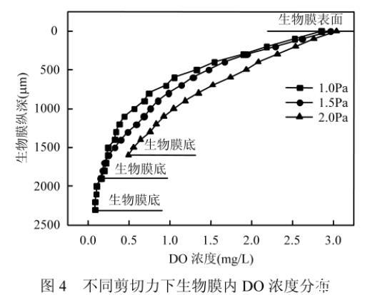 圖4不同剪切力下生物膜內DO濃度分布