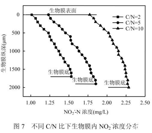 圖7不同C/N比下生物膜內NO2-濃度分布