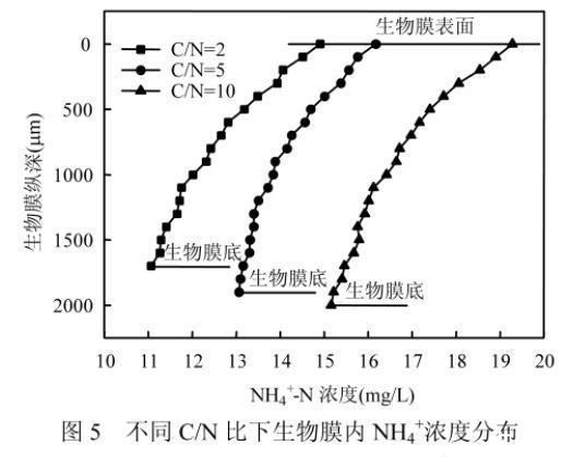 圖5不同C/N比下生物膜內NH4+濃度分布