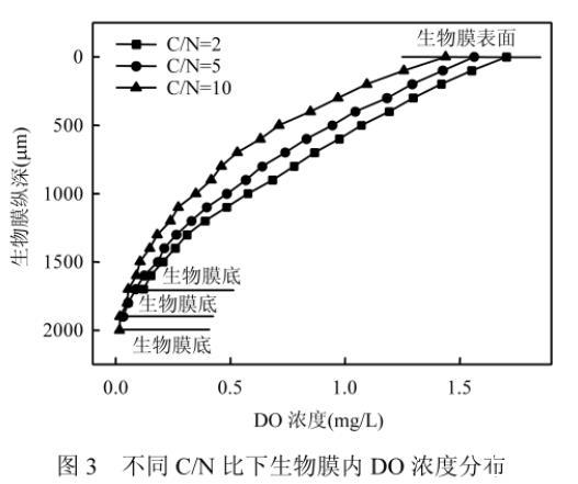 圖3不同C/N比下生物膜內DO濃度分布