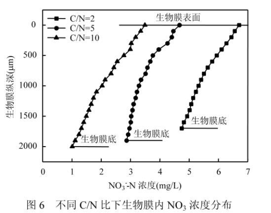 圖6不同C/N比下生物膜內NO3-濃度分布