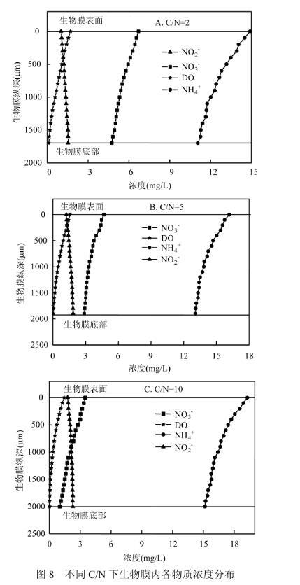 比較圖8中3個圖可以得到:在不同C/N比條件下,各物質濃度在生物膜內的變化趨勢并沒有不同,但是各物質濃度有較大的差別。C/N=2時,存在好氧區和厭氧區,幾乎不存在缺氧區,C/N=5和C/N=10時距離生物膜底部分別出現400μm和500μm的缺氧區,這是由于提高了水相中的COD濃度,促進了生物膜內微生物的生長,一方面加快了的DO的消耗,另一方面增加了生物膜厚度,阻礙了DO的傳質,從而使得生物膜內呈現出上部好氧底部缺氧的分布。