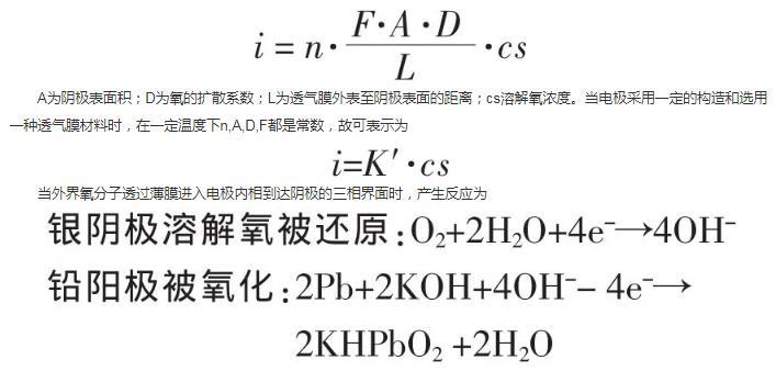 即氧在銀陰極上被還原為氫氧根離子,并同時向外電路獲得電子;鉛陽極被氫氧化鉀溶液腐蝕,生成鉛酸氫鉀,同時向外電路輸出電子。接通外電路之后,便有信號電流通過,其值與溶氧濃度成正比。