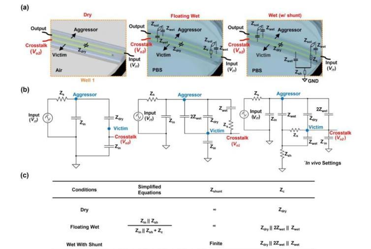 圖2.不同測量條件下的串擾電路模型。(a)雙電極串擾測量電路和組件示意圖。Zdry:空氣環境中兩個電極之間的耦合阻抗。Zwet:通過封裝實現的導線與濕介質之間的耦合阻抗。Zsh:單個電極到地之間的分流電阻。Zsol:濕介質的溶液電阻。Zin:數據采集系統的輸入阻抗。Zs:微電極的現場阻抗。(b)串擾測量裝置的等效電路。(c)在不同條件下計算串擾的簡化方程表。Zc:兩個電極之間的總耦合阻抗。