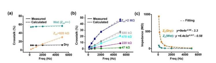 圖3.串擾結果與測量條件和器件參數的關系。(a)在干式、浮動濕式和濕式/分流條件下測量和計算的串擾頻譜。實線:測量到的串音;虛線:使用測量到的耦合阻抗(Zdry、Zc)計算出的串音。(b)不同分流電阻下的測量和計算串音。實線:測量到的串擾;虛線:利用測量到的耦合阻抗(Zdry,Zc)計算出的串擾。(c)耦合阻抗Zdry和Zc的頻譜。虛線:擬合曲線,擬合方程顯示在面板中。電極跡線寬度:100微米,跡線重疊長度:14毫米。