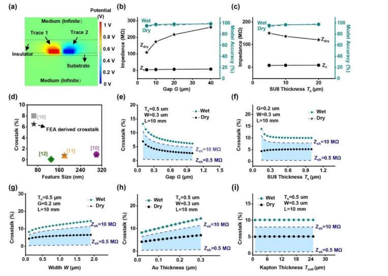 圖4.耦合阻抗模擬和串擾預測。(a)在COMSOL中建立的仿真模型與靜電位圖。(b)在不同條件下,模擬耦合阻抗與兩個電極跡線之間間隙的函數關系,串擾模型的推導精度與測量值進行比較。左軸:模擬耦合阻抗;右軸:串擾模型精度。(c)在不同條件下,模擬耦合阻抗是封裝層(SU8)厚度的函數,推導出的串擾模型精度與測量值進行了比較。左軸:模擬耦合阻抗;右軸:串擾模型精度。(d)最新硅探頭報告的串擾值與使用我們的模型模擬的串擾值的比較。黑星表示模擬值。(e)FEA得出的串擾與納米級器件中的痕量間隙的函數關系。藍色區域:分流電阻為0.5至10 MΩ時的串擾。(f)FEA導出的串擾與納米級器件封裝層(SU8)厚度的函數關系。藍色區域:分流電阻為0.5至10 MΩ的串擾。(g)FEA得出的串擾與納米級器件中金痕量寬度的函數關系。(h)有限元分析得出的串擾與納米級器件中金痕量厚度的函數關系。(i)FEA得出的串擾與納米級器件中基底厚度的函數關系。藍色區域:分流電阻為0.5至10 MΩ的串擾。