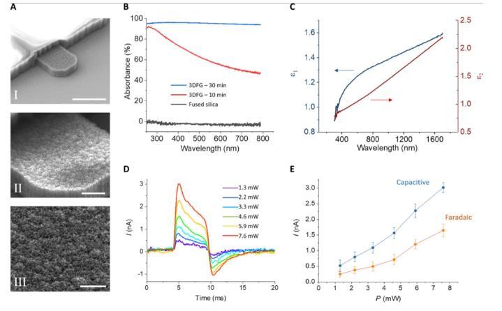 圖1三維多孔金柵(3DFG)的掃描電子顯微鏡(SEM)成像和光學(xué)特性表征。(A)5微米3DFG電極的SEM圖像。比例尺:5微米(I)、1微米(II)和0.5微米(III)。(B)熔融石英(灰色)、在800°C下合成10分鐘的3DFG(紅色)和在800°C下合成30分鐘的3DFG(藍(lán)色)的紫外-可見光吸收率隨波長的變化。(C)3DFG在可見光和近紅外范圍內(nèi)的介電常數(shù)的實(shí)部(ε1)和虛部(ε2)。(D)在1064納米超快(皮秒)脈沖激光激發(fā)下,3DFG電極與磷酸鹽緩沖液(PBS)界面產(chǎn)生的光電流,激光強(qiáng)度變化時(shí)的情況。脈沖序列持續(xù)時(shí)間為6毫秒。(E)激光激發(fā)產(chǎn)生的光電流的電容分量和法拉第分量。電容值取激光激發(fā)開始時(shí)的最大電流峰值。法拉第值計(jì)算為激光脈沖序列結(jié)束前最后1毫秒部分的平均值。