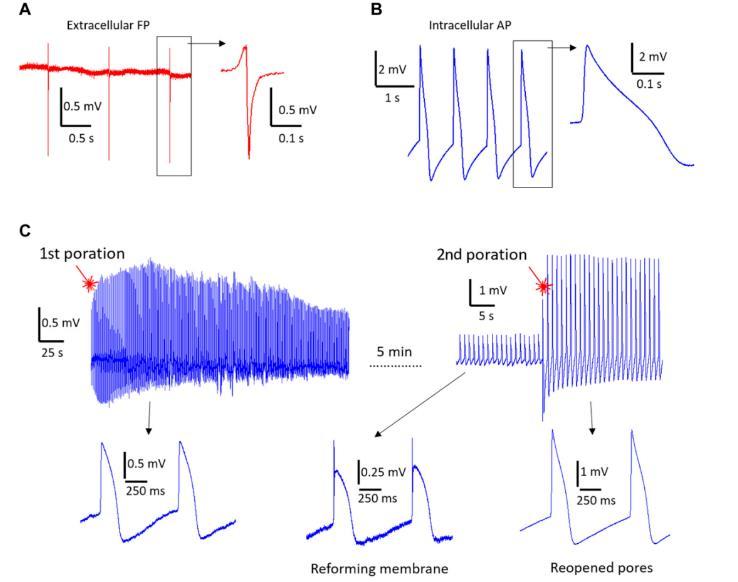 圖3電生理記錄。(A)使用50微米電極的3DFG-MEA對誘導多能干細胞來源的心肌細胞(hiPSC-CMs)進行的代表性體外場電位(FP)記錄。(B)激光照射后在50微米電極的3DFG-MEA上進行的代表性細胞內動作電位(AP)記錄。(C)激光照射后細胞膜修復以及體外場電位信號重新出現時細胞內耦合的時間穩定性。右側顯示,用激光第二次刺激心肌細胞,產生新的孔隙并恢復細胞內AP記錄。