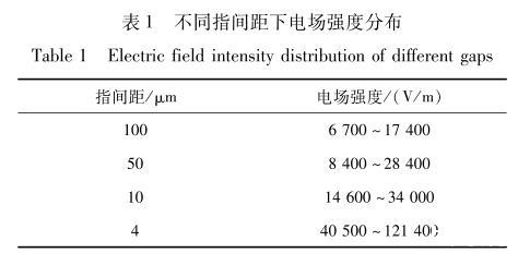 圖2~5分別對不同指間距的叉指微電極的電場強度分布仿真,根據仿真結果可以看到,隨著指間距的減小,叉指微電極中電場強度的分布越來越均勻,而且場強值也越來越大(見表1),到指間距為4μm時尖端效應基本不存在,說明指間距的減小對叉指微電極之間的電場分布有重要影響。相關研究也表明,叉指微電極指間距的減少的確可以促進電極間穩態過程的建立,加快反應動力學過程,提高氧化還原效率,這也從另一方面解釋了上述仿真結果。該結果為碳納米管氣敏傳感器微叉指電極的設備提供了參考。