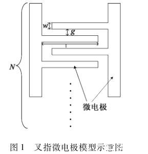 微電極的結構模型采用常用的叉指型電極結構,對該極結構理論分析和數值模擬表明,表明當微電極的長度遠遠大于指間距和寬度時,尖端效應可以忽略不計,而指間距成為影響電場強度分布的最大因素。因此,要通過仿真軟件對叉指微電極的電場強度分布情況進行模擬仿真,通過分析不同結構參數下電場強度的分布情況來獲得較為理想的電極結構。叉指微電極的理想模型如圖1所示,其主要設計參數有指間距(g)、長度(l)、寬度(w)以及電極數目(N)。本文通過模擬分析不同指間距尺寸的叉指微電極的電場強度來獲得最合理的設計參數。