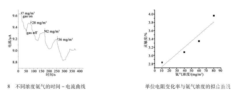 圖8不同濃度氨氣的時間-電流曲線,圖9單位電阻變化率與氨氣濃度的擬合直線