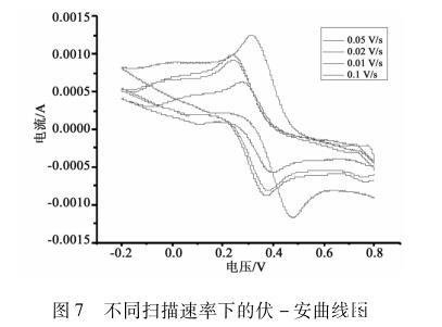 對所制備的叉指微電極,采用微電極檢測技術(shù)中常用的電化學(xué)方法進行循環(huán)伏安測試實驗,分別設(shè)置掃描速率為0.01、0.02、0.05、0.1 V/s,得到的循環(huán)伏安曲線如圖7所示。