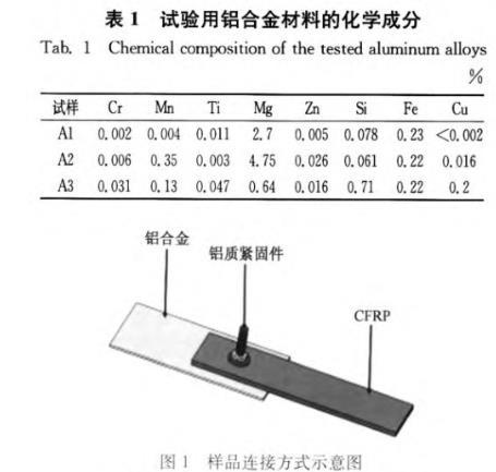 試驗(yàn)用金屬材料為三種鋁合金(編號分別為A1,A2,A3),化學(xué)成分如表1所示。鋁合金尺寸為76mm×38mm×1mm,CFRP尺寸為101mm×25mm×2.2mm,兩種材料用鋁制緊固件按圖1所示方式連接,所有試樣連接用力矩大小相同。試驗(yàn)所用的CFRP有兩種不同的表面狀態(tài),一種是未打磨的表面(U),另一種是與鋁合金覆蓋表面用1 000號砂紙打磨(S)。利用ET-3000臺階儀測試兩種表面粗糙度,計(jì)算可得,U表面平均粗糙度為0.98μm,明顯高于S表面0.25μm。