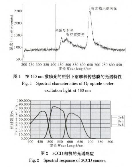 前人對PtOEP的熒光淬滅特性進行了詳細的研究,本文采用對氧分子具有良好淬滅作用的八乙基卟啉鉑(Platinum(II)octaethylporphyrin,PtOEP)作為溶解氧熒光指示劑,摻雜對氧分子無響應的香豆素染料作為熒光能量供體,在激勵光源的照射下,包埋在薄膜中的PtOEP可以647 nm附近產生一個較強的發射熒光。由于PtOEP和香豆素染料都在480 nm附近存在一個吸收峰,因此可以采用同一個激勵光源對熒光指示劑和香豆素進行激勵。將PtOEP、香豆素染料、聚苯乙烯,按照1%/1%/4%(wt/wt/wt)的比例溶解于三氯甲烷中形成均勻的液體,利用厚度為125μm的PETP膜作為支撐膜,采用刀片式涂膜機將制備的混合液均勻的涂布在支撐膜表面,形成約100μm厚的液體膜,在室溫下靜止6 h,待溶劑揮發后形成厚度<10μm,面積為150 mm×150 mm的傳感膜。利用光譜儀對制備傳感膜進行檢測,其光譜響應如圖1所示。香豆素的發射波長峰值在500 nm附近,熒光指示劑的發射波長峰值在650 nm附近。這2個波長的發射光中,只有熒光指示劑熒光強度與溶解氧濃度相關,其中香豆素熒光強度不受溶解氧濃度影響,并且兩者峰值位置存在著較大的差距,有效地減少了相互之間的光學干擾。圖2為所采用的3CCD相機的3個光譜通道的響應,因此在光學鏡頭中設置一個470 nm長通濾波器將光源發射光濾除,就可利用綠光CCD和紅光CCD同時記錄PtOEP熒光指示劑的發射光和香豆素參考光的光強,簡化了光路系統,簡化了平面光極觀測系統的光路結。