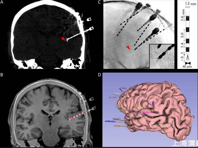 圖1.多模態微電極識別。A.冠狀面的顱骨計算機斷層掃描(CT),顯示了宏觀電極的軌跡以及微電極束的位置(紅色箭頭)。B.CT掃描與解剖學T1磁共振成像(MRI)的自動疊加,使得能夠可視化微電極在腦實質中的位置,同時還能自動識別沿腦內軌跡的宏觀電極接觸點(紅色圓圈)。C.放射影像顯示了腦內電極的二維位置。紅色箭頭指示了一個微電極束的位置,在前幾張中可見。插圖:微電極導線的放大圖。注意微導線的散開情況。右側插圖:宏觀-微電極幾何形狀的示意圖。D.受試者皮質解剖結構的三維Epiloc解剖重建,顯示了腦內宏觀電極的植入方案。