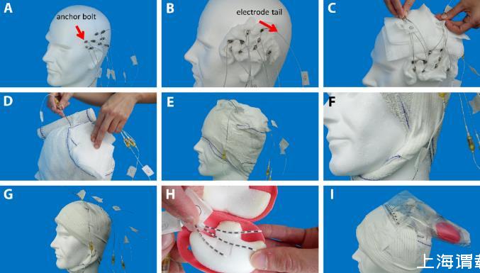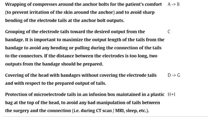 圖2.手術包扎的主要步驟。A.手術植入的宏觀電極和宏觀-微電極。箭頭所示為一個錨定螺栓。B.纏繞在宏觀和微電極錨定螺栓上的敷布。箭頭所示為一個電極尾部。C.在頭部上方將電極尾部捆成一到兩部分。D.用敷布和繃帶將其固定在一起,同時避免覆蓋電極尾部。E.在兩個不同的位置讓電極尾部從繃帶中穿出。F.制作一個頦帶。G.冠狀和矢狀方向的粘性膠帶條,用于將繃帶固定在適當位置。H.輸液保護盒,用于在連接前保護微電極。I.在患者病房連接之前,將所有連接器和盒子放在頭部上方的塑料袋中進行保護。