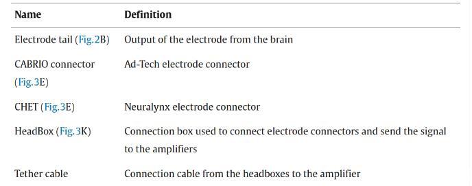 患者在植入后的第一天與采集系統相連。首先,將所有額外的腦電圖頭皮電極放置在患者頭部(沒有植入電極的位置)。將一個接地電極放置在鎖骨下方,并且將兩個心電圖電極放置在胸部。其次,將深度電極尾部連接到用于宏觀電極的CABRIO連接器,以及用于微電極的CHET頭級放大器(NeuraLynx公司,美國蒙大拿州博茲曼)(圖3,表2和表3)。連接電極尾部是電極操作中的關鍵步驟,需要格外小心。因此,我們制定了一個程序,以提高患者的舒適度,避免任何錯誤操作以及電極尾部上可能會弄斷導線的拉伸載荷,并且避免連接電纜上可能導致斷開連接的任何張力。為了保持無菌狀態,在患者出院之前不會拆除在手術室完成的包扎。圖3中的步驟G到J每2到3天重新進行一次,以便重新粘貼頭皮電極,但不會移動連接器,以避免操作電極尾部。