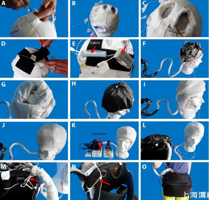 A和B.包扎準備,帶有孔洞以便在植入區域外添加頭皮電極。C.放置頭皮電極。D.在包扎帶上粘貼魔術貼帶。E.連接連接器并將其放置在魔術貼帶上。箭頭顯示了兩種連接器類型:CABRIO連接器和來自NeuraLynx公司的CHET頭級放大器。請注意,NeuraLynx公司的CHET頭級放大器用塑料夾封閉,以防止其打開。這些夾子由小型電氣線槽制成。也可以使用普通膠帶,但不太方便,并且在取下時常常會使CHET頭級放大器變得黏糊糊的。F.將所有連接器電纜捆在一個包扎帶內。G.用敷布覆蓋連接器。H.用“導電織物”覆蓋連接器。I.用兩條包扎帶覆蓋并固定。J.最后用網罩覆蓋。K.連接到頭箱。箭頭所示為一個頭箱。L.將頭箱放置在一個袋子里。M和N.將輸入和輸出電纜固定在袋子上。箭頭顯示了電纜是如何固定的。O.患者移動時隨身攜帶這個袋子。
