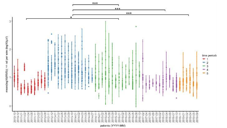 圖7.每位患者每根導線每天的均方根值(RMS)。每個點代表每根導線在數天內測量的均方根值的平均值。請注意,y軸以對數10刻度表示,數值1、2和3分別對應10微伏、100微伏和1000微伏。這些點是根據對數10(均方根)平均值以及以年-月(YYYY-MM)表示的患者ID繪制的。條形表示每根導線的對數10(均方根)值的標準差。顏色編碼區分了5個時間段(紅色:第一時間段,藍色:第二時間段,綠色:第三時間段,紫色:第四時間段,橙色:第五時間段)。在第二時間段和第三時間段之間對患者房間進行了電清潔處理。在第三時間段和第四時間段之間,電極型號更換為強化的型號3。時間段之間的顯著差異用星號表示(:0.05