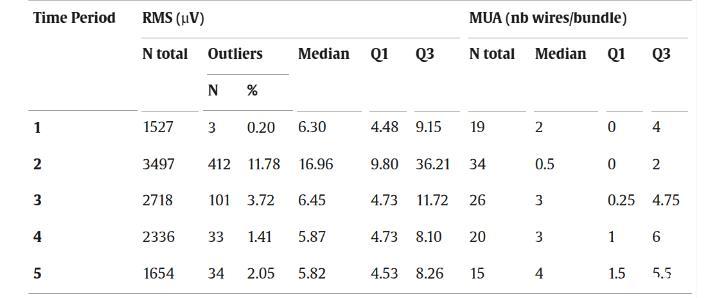 對記錄時間段內均方根(RMS)差異進行研究的線性混合模型(LMM)顯示,時間段有顯著影響(卡方值=99.29,p<0.001,圖7,描述性統計見表5)。與第二時間段相比,在第一時間段(平均差估計值±標準誤=-0.50±0.06,p<0.001),即微電極和宏觀電極分開記錄時,以及在房間進行電隔離后的第三時間段(平均差估計值±標準誤=-0.33±0.06,p<0.001)、第四時間段(平均差估計值±標準誤=-0.47±0.06,p<0.001)和第五時間段(平均差估計值±標準誤=-0.46±0.07,p<0.001),均方根值顯著更低。第一時間段和第三時間段之間也有顯著差異,第一時間段的值更低(平均差估計值±標準誤=-0.17±0.06,p=0.037),但其他時間段之間沒有顯著差異(p<0.05)。第三時間段和第四時間段之間的差異不顯著,但第三時間段的均方根中值更高。除了第四時間段和第五時間段之外,所有時間段的異常值數量都不同(成對費舍爾精確檢驗,所有p<0.001,描述性統計見表5)。異常值最少的時間段是第一時間段,其次是第四和第五時間段、第三時間段以及第二時間段。