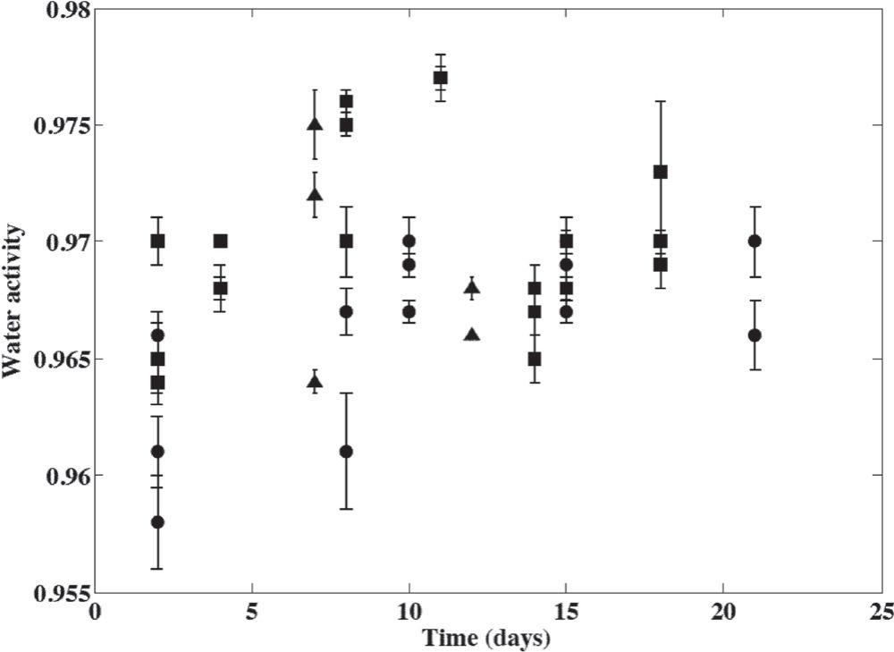 圖4、13.5°C下奶酪成熟過程中,奶酪表面微觀水活性的變化。三批奶酪的值通過不同符號(hào)表示,點(diǎn)和誤差條表示在同一奶酪表面上獲得的15或30次觀察的平均值和標(biāo)準(zhǔn)差。奶酪的清洗在第9或第10天和第13或第14天進(jìn)行。