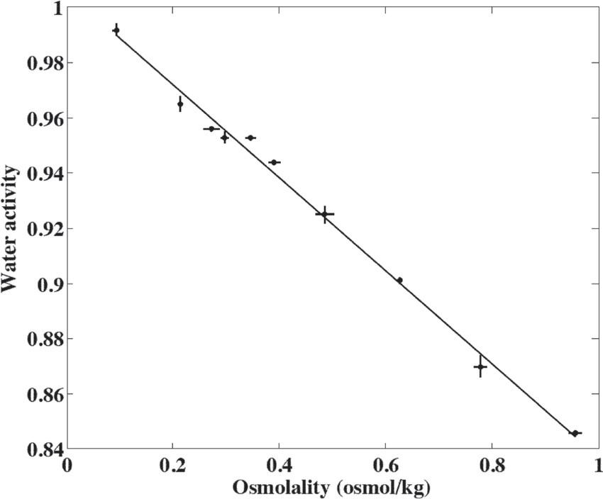 圖1、人工奶酪樣品中,NaCl或水與奶酪混合后的滲透壓與水活性的關(guān)系。點(diǎn)表示觀察值的平均值,誤差條表示滲透壓的10次重復(fù)實(shí)驗(yàn)和水活性的4次重復(fù)實(shí)驗(yàn)的兩個(gè)標(biāo)準(zhǔn)差。
