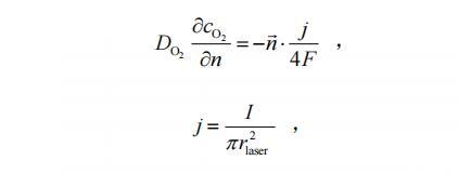 其中,Di為擴散系數,氧氣的擴散系數為2.1×10-9 m2/s,j是電流密度,F是法拉第常數,為96485 C/mol,rlaser是光斑半徑。通過給定電流I來確定擴散通量,忽略了電極表面的化學反應過程對氣體產生的影響。例如,析氧反應涉及到水分子在催化劑表面的吸附、然后失去電子發生氧化反應,生成氧氣、質子和電子等多個步驟,直接給定擴散通量忽略了這些中間過程對氣體產生的影響。另外,模型將電極表面簡化為平面,忽略了電極表面的粗糙度對氣體在電極表面的吸附和擴散路徑的影響。