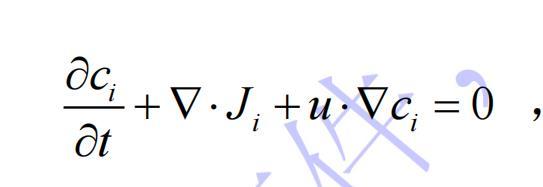 其中,ci是濃度,Ji是質量擴散通量,u是速度。下標i表示化學物種,在本研究中是H2O或者O2。由于分子擴散,稀釋物種模型包含質量輸運。因此,擴散通量也可以寫成如下,