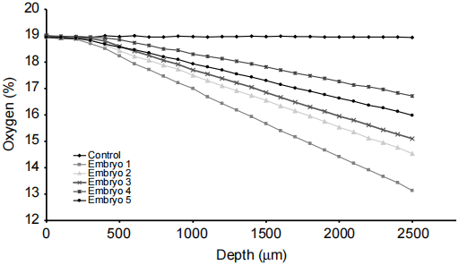 圖3、由5個第7天胚泡的呼吸速率產生的氧梯度記錄。對照梯度相當于空毛細管中的測量值,作為負參考(=無呼吸活動)。每個梯度的斜率針對每個胚胎。
